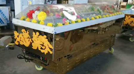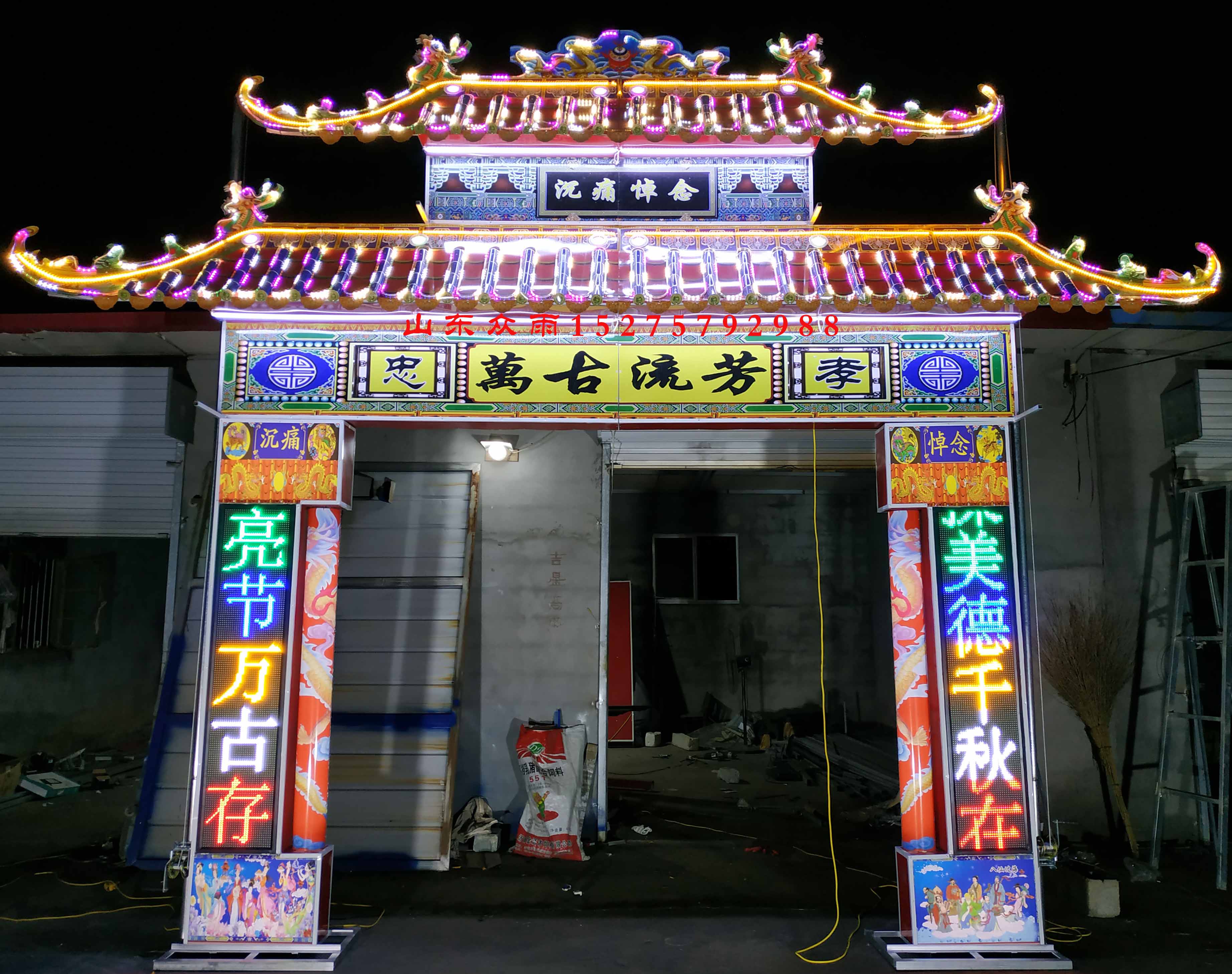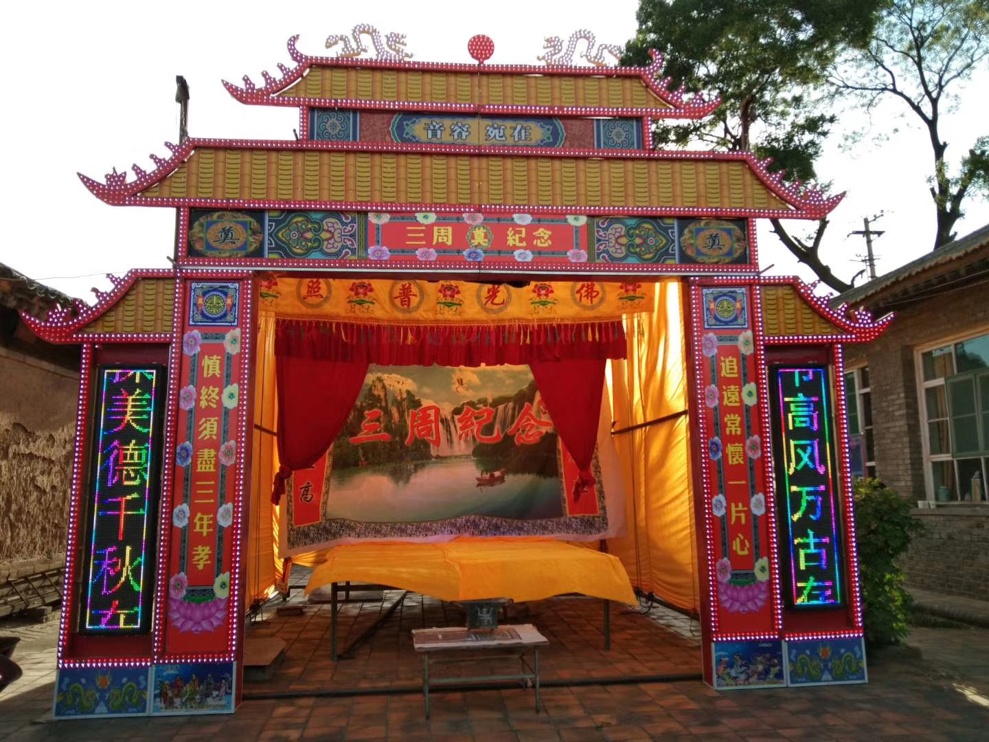 費(fèi)縣眾雨工藝棚有限公司設(shè)計(jì)生產(chǎn)豪華LED立體靈棚,依據(jù)古建筑建筑風(fēng)格,純手工精心制作,可分體可折疊,方便運(yùn)輸,整體LED彩色燈光,用料均可防雨,適合戶(hù)外專(zhuān)用。冰棺用料考究,精銅管制造,大功率雙壓縮機(jī),使得機(jī)器設(shè)備有充足的制冷效果。